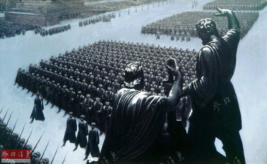 9时45分,以国防委员会主席苏联大元帅斯大林为首的苏联领导人出现在列宁墓上。图为描绘苏联领导人阅兵的画作。