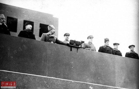 上午九时,斯大林对受阅部队发表了历史性的演说。斯大林站在列宁墓的观礼台激动的说,“红军战士、指挥员和政治工作人员、男女游击队员同志们!全世界都注视着你们,把你们看作是能够消灭德国侵略者匪军的力量。处在德国侵略者压迫下的欧洲被奴役的各国人民都注视着你们,把你们看作是他们的解放者。”图为斯大林在观礼台上发表讲话。