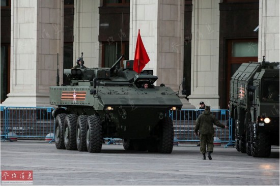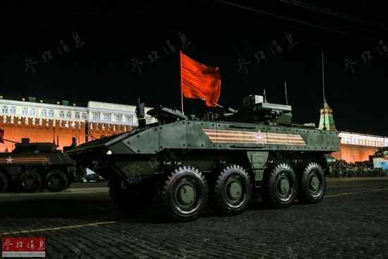 ?除了履带式战车外,作为BTR系列战车的继任者,“回旋镖” 轮式装甲战车也是首次亮相。