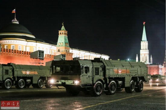 “伊斯坎德尔”战术导弹发射车方队。