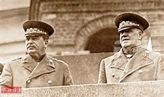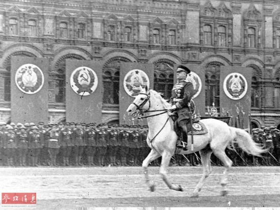 1945年6月22日,卫国战争爆发4周年的这一天,斯大林发布命令:“为庆祝伟大卫国战争的胜利,兹定于1945年6月24日在莫斯科红场举行作战部队、海军部队、莫斯科卫戍部队胜利阅兵式。在举行胜利阅兵式时,由我的助理、苏联元帅朱可夫负责检阅,苏联元帅罗科索夫斯基负责指挥。”按理说,担任阅兵首长这一光荣而神圣的使命非斯大林莫属。但由于阅兵首长当天要骑马上红场,没想到已经多年不骑马的斯大林在练习中不慎从马上摔下,碰伤了胳膊,只好临时请苏军副统帅朱可夫代劳。
