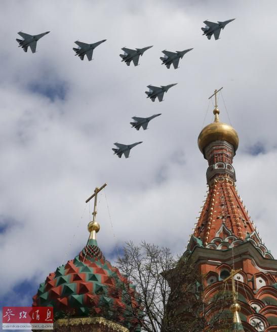 图为苏-30SM和苏-35S战斗机联合编队飞越红场。