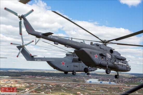 米-26直升机处在编队中央位置,米-8直升机在一旁跟进。