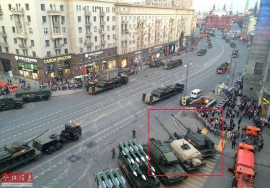 ?图为4月底,俄军进行阅兵彩排时,众多重装备在莫斯科街头集结的图片,值得注意的是“道尔”M1防空系统旁红框中的这两种自行火炮,可明显看出“联盟”SV(左)的车身要长于2S19(右),而且火炮身管更为细长。
