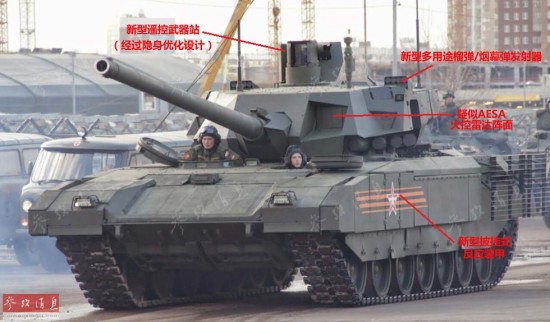 ?根据此前俄媒的宣传,T-14几大特点如下:1 首次采用无人炮塔(乘员全部置于车体内部),2首次在坦克上搭载AESA(有源相控阵)雷达,3搭载了最新的“阿富汗石”主动防御系统。