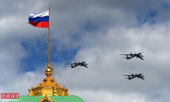 除直升机外,俄空军固定翼战机才是空军阅兵的主角,图为5月5日,参加阅兵彩排的图-95MS轰炸机编队。