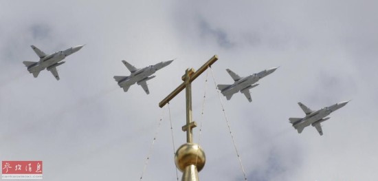 图为苏-24战斗轰炸机群飞越红场。