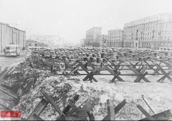 11月1日,朱可夫在回答斯大林关于是否能在红场举行阅兵式时说:“纳粹德军在最近几天内没有力量发动大规模进攻,他们在10月份的作战中遭到了极其严重损失,现在正补充人员兵力和调整部队的部署。但是德国军队能够而且肯定要进行破坏行动。”图为1941年,莫斯科街头的防御设施。