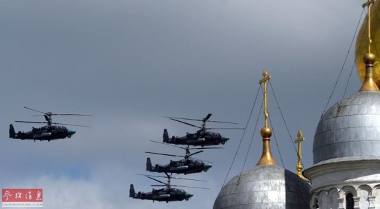 图为卡-52武装直升机编队飞越红场。