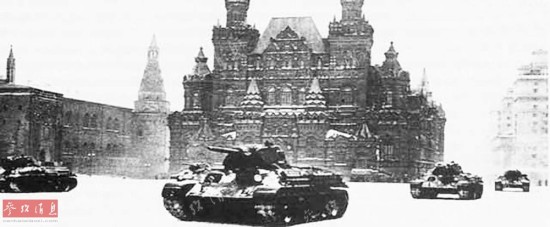 历史不会忘记在兵临城下之时莫斯科进行的盛大阅兵仪式。向所有反法西斯的英雄致以崇高的敬意!图为受阅的坦克部队驶过红场。