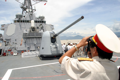 资料图片:越南海军军官在美海军驱逐舰上拍照。(图片来源于网络)
