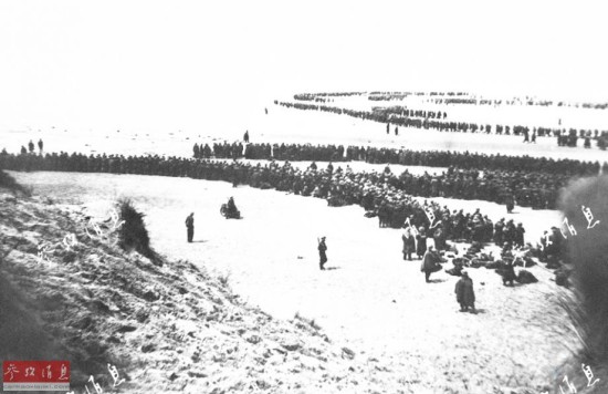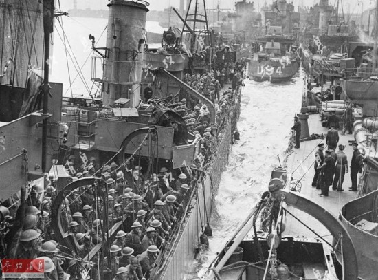 1940年5月25日,英法联军防线在德国机械化部队快速攻势下崩溃之后,英军在敦刻尔克这个位于法国东北部靠近比利时边境的港口城市进行的当时历史上最大规模的军事撤退行动。图为集结在敦刻尔克海滩上准备撤离的英法联军部队。