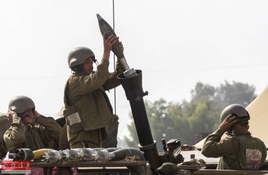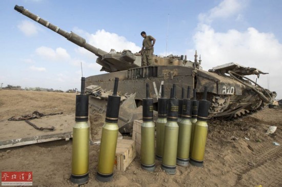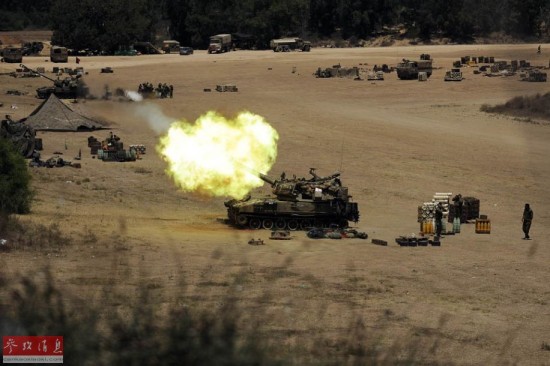 7月24日,在以色列与巴勒斯坦边境,以色列国防军坦克向加沙地带发射155mm榴弹炮。