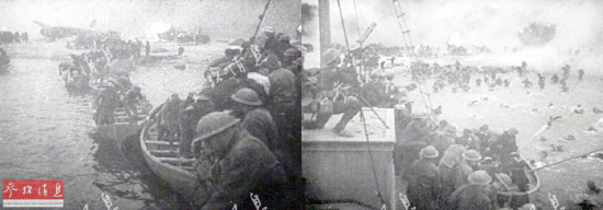 ?图为敦刻尔克滩头,英军冒着德军的炮火撤离。左图为英军利用各种小型救生艇撤退,右图为英军撤离敦刻尔克海滩时,遭到德军炮击,图中还能看到船上的英军使用刘易斯机枪对空射击。但需要指出的是,这么逼真的画面(右图)其实来源于1943年的美国电影《分而治之》。