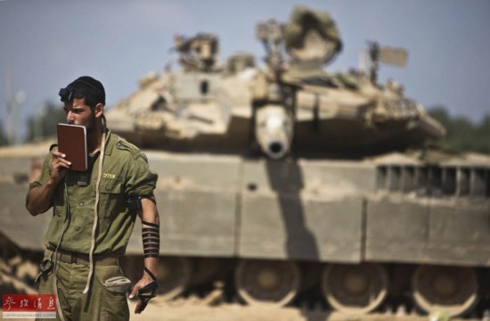 7月24日,在以色列与巴勒斯坦边境,一名以色列国防军士兵在坦克旁做祷告。