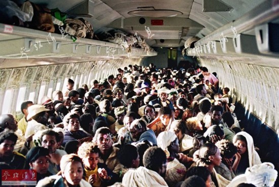 5月24日,一架以色列航空的波音747货机更破天荒地一次过运载1122人(已登录的只有1087人,不少未登录的都是在母亲怀内的小童),其中有两人是在该航班上出生的。图为搭乘747货机撤离的埃塞难民。
