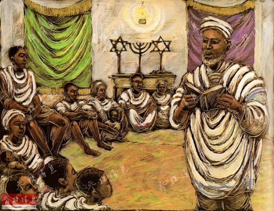 直到18世纪60年代,一群欧洲探险家来到埃塞俄比亚探寻尼罗河的源头时,才无意中发现“有些埃塞俄比亚人居然也信奉犹太教”。这些信奉犹太教的人主要聚居在埃塞俄比亚塔纳湖以北地区。和大多数埃塞俄比亚人一样,他们肤色黝黑,生活水平很低,文盲率很高。由于信仰不同,他们在当地长期被当作一个少数民族对待,备受歧视,长期被剥夺拥有土地的权利。但是,他们不顾民族与宗教的歧视,坚守自己的传统,信奉犹太教,诵读用吉兹语翻译的《圣经》和其他犹太教经文。虽然他们实行的某些宗教仪规和习俗,同主流犹太人社会存在差异,但他们仍严格遵守犹太教的基本法规和传统,如实行割礼,守安息日、逾越节、赎罪日等犹太教节日。图为描绘埃塞犹太人宗教学校的画作。
