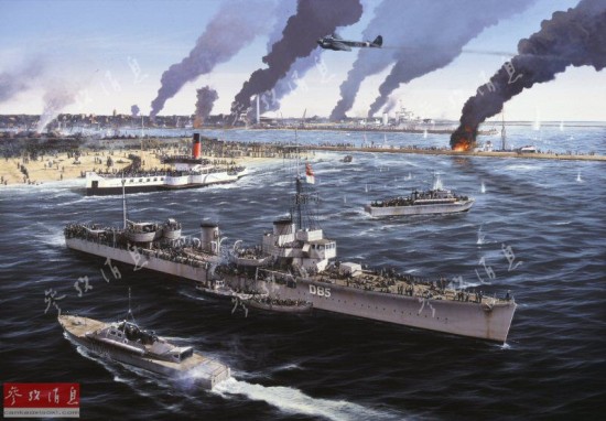 图为反映敦刻尔克撤退场面的绘图,可以看到包括驱逐舰、鱼雷艇,甚至民用客船在内的舰艇都参与了撤离行动。