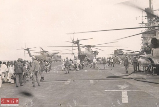 美军在此次行动中出动了包括多艘航母、多艘登陆舰艇以及上百架直升机在内的名为“第76特遣舰队”的庞大撤离力量。图为美军CH-53重型直升机运送大批南越难民降落到美军航母上。