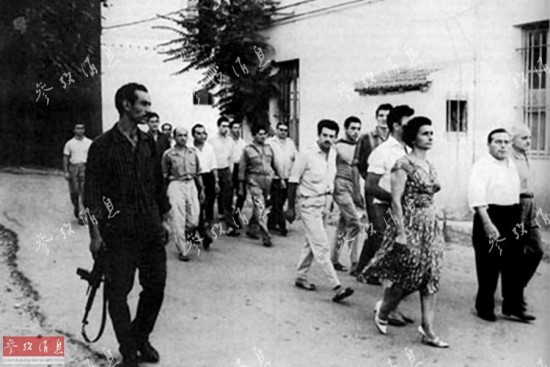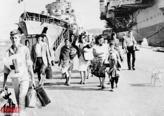 二战后的首次大撤离,发生在北非地区。从1954年开始,历经8年艰苦卓绝的独立战争之后,阿尔及利亚“民族解放阵线”(简称FNL)组织的解放军终于击败了法国殖民者,赢得民族独立。出于各种原因,新政权将大批法国侨民驱逐出境。图为1962年,FNL武装人员驱逐居住在阿尔及利亚的法裔犹太人及基督徒。
