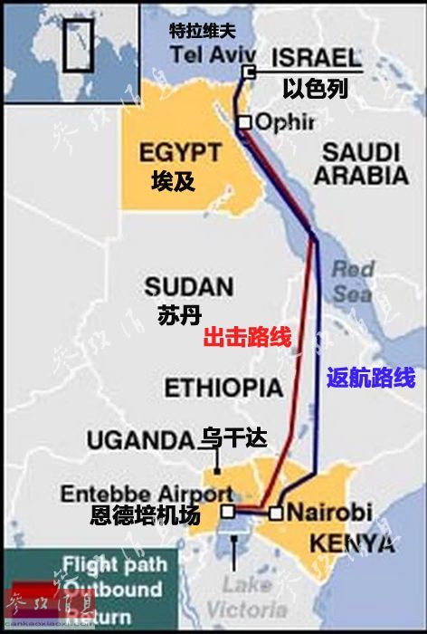 在世界特种作战史上,以色列千里奔袭乌干达恩德培机场营救被挟持犹太人质,同样堪称经典战例。1976年6月27日,一架满载100多名犹太乘客的法航客机被巴勒斯坦解放组织的恐怖分子劫持到乌干达恩德培机场,为营救人质,以色列特种部队调集精英力量组成了特别突击队,分别搭乘4架C-130运输机,发动了代号“霹雳行动”的远程突袭行动。 图为以军“霹雳行动”的飞行路线示意图,红色为出击路线,蓝色为返航路线。