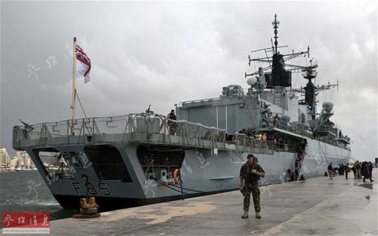 除了空中撤侨外,英军战舰也抵近战区,直接从海上撤侨。图为英国海军“坎伯兰”号护卫舰停靠在利比亚港口班加西准备进行撤侨行动,摄于2013 年1月。