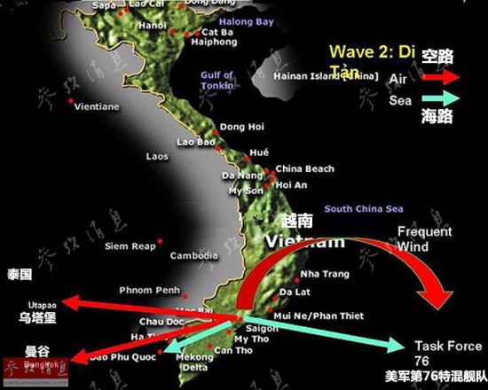 我们再把时间调整到1975年4月29日,当时,绵亘20年的残酷越战已接近尾声,为了抢在越共部队进入西贡(今胡志明市)前救出大批南越难民和美国侨民,美军发动了代号“常风行动”的大规模撤离行动。图为该行动的撤离路线示意图。