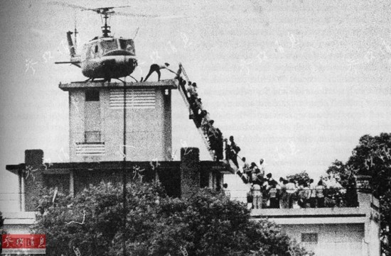 图为“常风行动”期间,南越难民排队搭乘楼顶上的直升机撤离西贡(今胡志明市)。