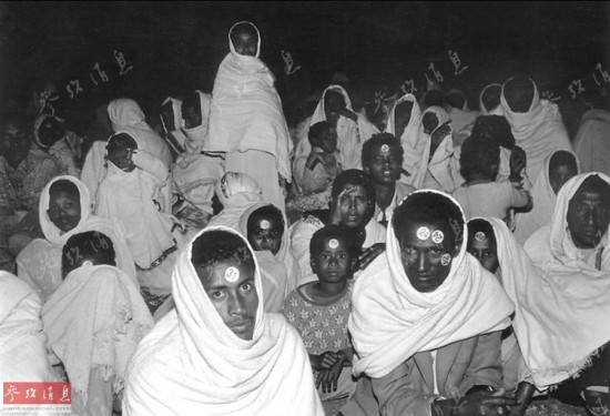 1973年,以色列犹太教的塞法迪大拉比首先作出正式裁决,裁定埃塞俄比亚犹太人是古以色列人的后裔,属于犹太人的一支。上世纪90年代,以色列实施了代号“所罗门行动”的秘密撤离行动。当时正值1991年5月,埃塞俄比亚的门格斯图政权倒台,厄立特里亚和提格雷族的反政府武装部队取得政权,混乱的局势让大批非洲裔犹太人面临生命危险。为此,以色列政府和犹太组织决定把在埃塞俄比亚的黑人犹太同胞空运回以色列,以助他们躲避内乱。图为准备搭乘运输机飞往以色列的犹太裔埃塞难民,一些难民额头上还贴有编号。