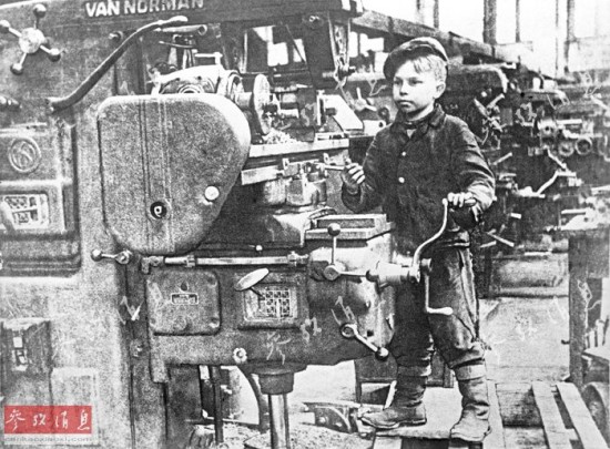 当时的苏联为了战胜法西斯可谓倾尽全力,图为在位于乌拉尔地区斯维尔德洛夫斯克州的彼尔姆发动机厂,一名12岁的少年技工正在娴熟操作机床,而他的个头还没有机器高。
