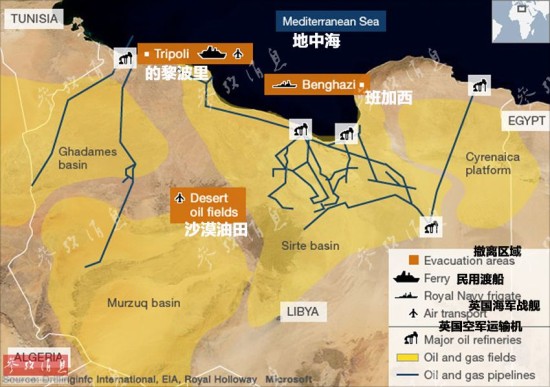 2011年的利比亚战争期间,英国也曾在1月至2月间,派遣空军运输机和海军战舰从利比亚远程撤侨。图为英国从利比亚撤侨路线图。