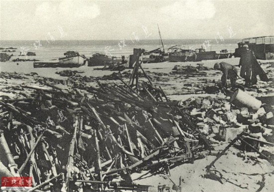 图为英法联军撤离后,德军士兵检查盟军遗弃在海滩上的武器装备。