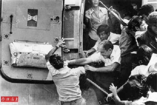 图为“常风行动”期间,金兰湾,溃逃的人们为争抢登上最后一批撤离直升机而大打出手。