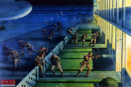 1976年7月4日晚11点01分(以色列时间),第一架C-130运输机在恩德培机场成功着陆,随着满载以军突击队的伪装奔驰车和路虎吉普从运输机中鱼贯而出,突击行动正式开始。图为艺术家绘制的闪击恩德培行动艺术图,图中可见以军突击队使用AK-47步枪(而非流传的加利尔步枪)与乌干达守军交火。