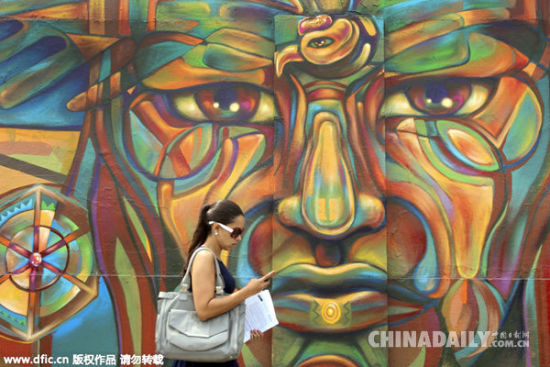 秘鲁首都利马,一名女子走过画有传统涂鸦的墙。(图片:东方IC)