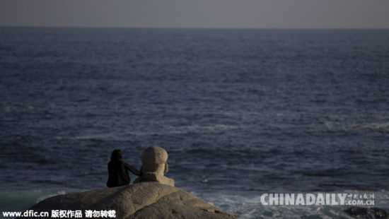 一名男子坐在诺贝尔文学奖得主,智利诗人聂鲁达的半身雕像旁边俯瞰大海。(图片:东方IC)