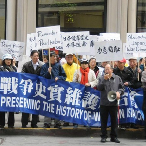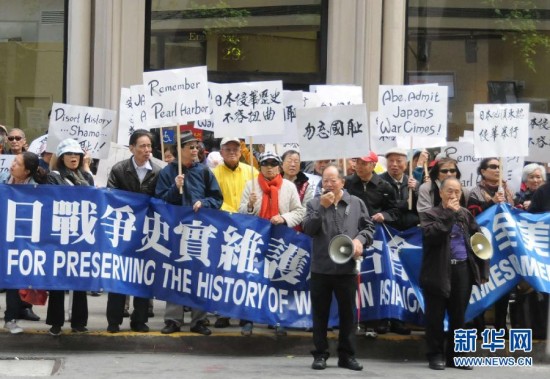 2015年4月28日,在美国旧金山,人们举行抗议活动,要求日本首相安倍晋三就日本二战侵略暴行道歉。新华社记者 徐勇摄
