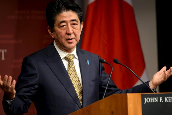 日本首相安倍在马萨诸塞州哈佛大学肯尼迪政府学院的论坛上发表演说。(路透社)