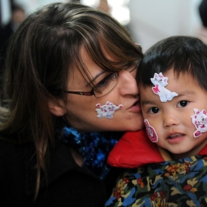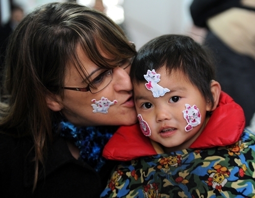 不同时代,人们通过不同方式学习雷锋。图为今年2月,来自美国的志愿者和一名孩子玩耍。 本报记者周科/摄