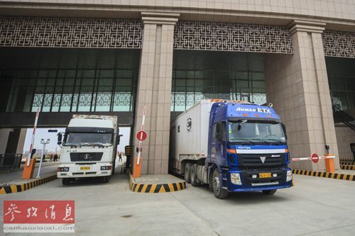 资料图片:两辆满载货物的车辆驶入喀什综合保税区主卡口。新华社记者 李晓玲 摄