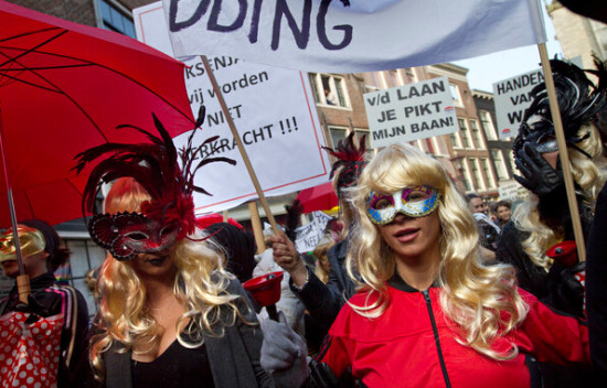 据台湾东森新闻网4月10日报道,过去,阿姆斯特丹红灯区裡骚首弄姿的性工作者世界闻名,但当局为了整顿该区的街道、人口买卖的问题,关闭了115个橱窗,目前只剩下385个。这样的举措使得许多性工作者的生计受到影响,他们不得不在9日走上街头,高举着“救救我们的橱窗!”、“停止关闭橱窗”等标语抗议,许多民众为了避免以真面目示人,还蒙着面参与游行。