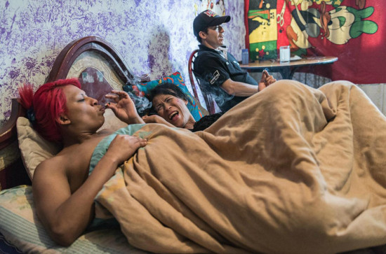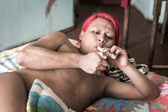 但并不是每一个卖淫的人都有足够的钱做变性手术,所以她们中的许多人依靠激素药物来让自己看起来更像女性。Arelis甚至都没有钱买这些药物,所以他只有在她的文胸里垫上袜子,这样外观上看起来才更像女性。图为Arelis起床前点燃一支烟。