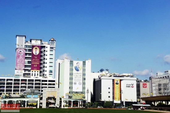 8月14日,在文莱斯里巴加湾,建筑物上挂着祝贺苏丹华诞的条幅。从14日开始,文莱从城市到乡村为苏丹哈桑纳尔·博尔基亚68华诞举办各式各样的生日庆祝活动。14日当天,文莱还举行苏丹华诞传统阅兵和苏丹努洛伊曼王宫的册封仪式。由于今年苏丹陛下68岁华诞正值穆斯林斋戒月期间,当局决定将华诞庆典系列活动延至8月举行。新华社发(杰弗里·黄摄)