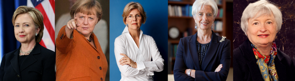希拉里·克林顿、安格拉·默克尔、伊丽莎白·沃伦、克里斯蒂娜·拉加德和珍妮特·耶伦(从左至右),这些已经暮年的成功女性可能开启了一个新时代。(资料图片)
