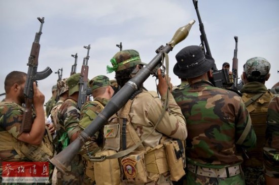 资料图片:6月3日,伊拉克什叶派民兵聚集在拜伊吉,准备对抗IS。
