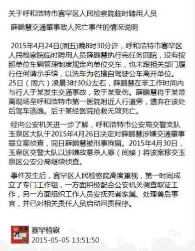 中新网5月5日电 据内蒙古呼和浩特市赛罕区人民检察院官方微博消息,4月25日凌晨,赛罕区人民检察院临时聘用人员薛鹏慧驾公车与行人于某发生交通事故,致其受伤。薛鹏慧将于某带离现场遗弃在医院附近人行道旁后逃逸,后于某死亡。目前该案移交警方继续侦查。