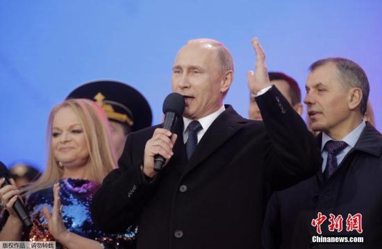 资料图:当地时间2015年3月18日,俄罗斯莫斯科举办音乐会与集会,庆祝克里米亚入俄一周年,总统普京出席并献唱国歌。