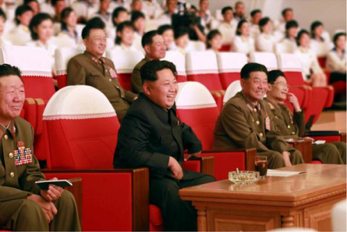 金正恩和人民军大将朴映式(红色圆圈内)一同观看军队艺术宣传队演出。(韩联社)