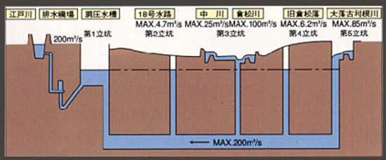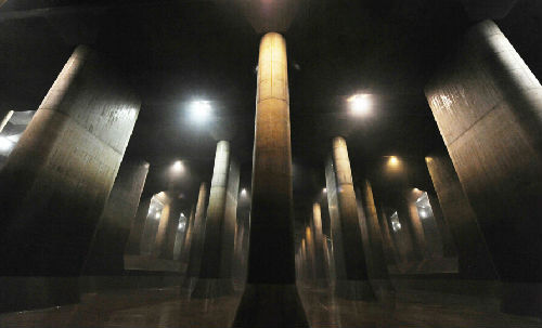 前4个竖井里导入的洪水通过下水道流入最后一个竖井,集中到由59根高18米、重500吨的大柱子撑起的巨大蓄水池中。