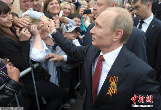 资料图:2014年5月9日,俄罗斯总统普京在克里米亚塞瓦斯托波尔出席纪念卫国战争胜利69周年的庆祝活动,与当地民众握手。这是当年3月克里米亚全民公投后加入俄联邦以来,俄罗斯总统首次到访克里米亚和塞瓦斯托波尔。